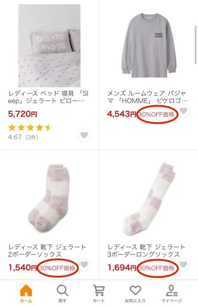 30%OFFになるのは主に、シーズンオフ商品や販売開始から一定期間が経過した商品などです。